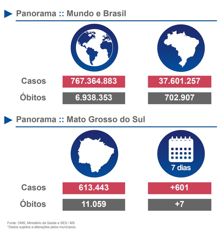 No Brasil já são 37.691.257 casos e 702.907 mortes, e no mundo são 767.364.883 casos e 6.938.353 falecimentos em decorrência da doença.